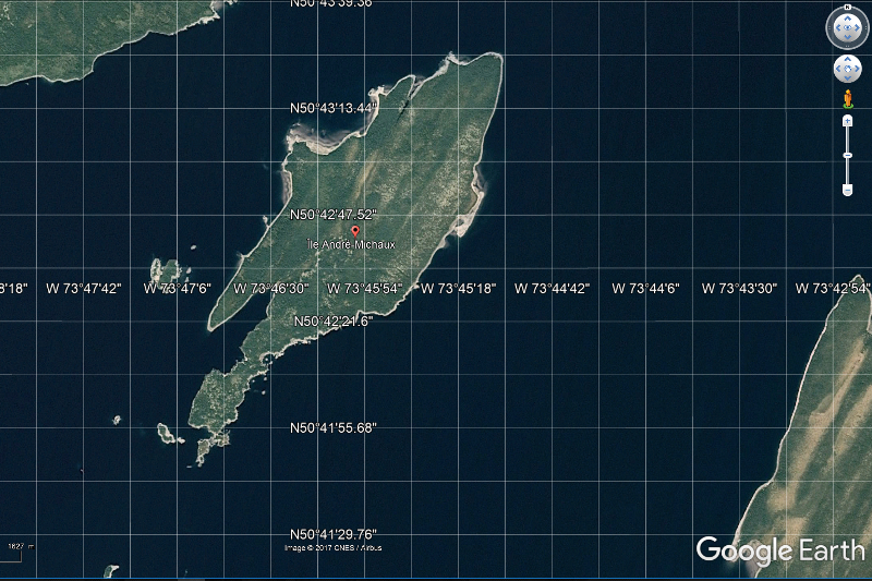 Lac Mistassini, île André-Michaux, image satellite générée par Google Earth 2017, Ile_Andre_Michaux_2017_800.