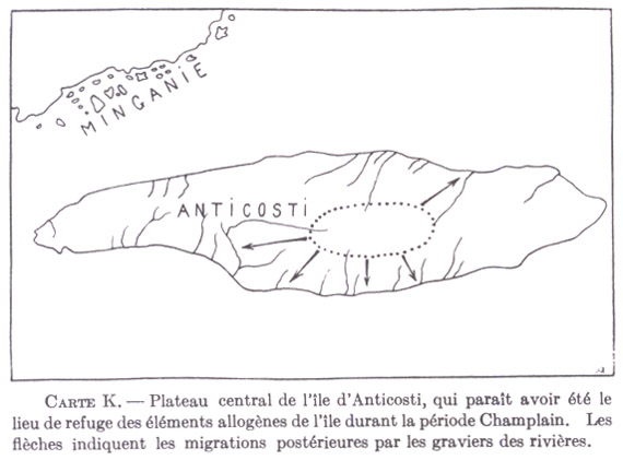 Champlain. Les flèches indiquent les migrations postérieures par les