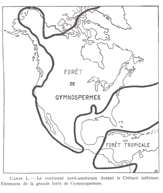 Carte L. ― Le continent nord-américain durant le Crétacé inférieur. Extension de la grande forêt de Gymnospermes.