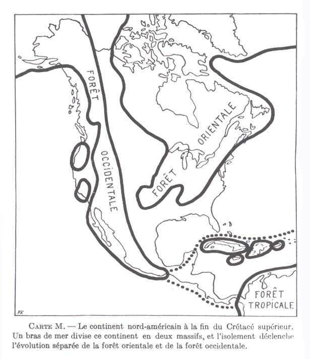 Carte M. ― Le continent nord-américain à la fin du Crétacé supérieur. Un bras de mer divise ce continent en deux massifs, et l'isolement déclenche l'évolution séparée de la forêt orientale et de la forêt occidentale.