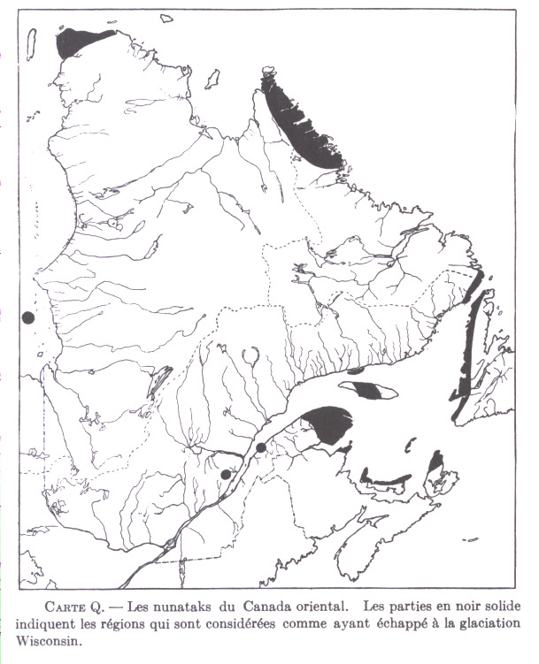 Carte Q. ― Les nunataks du Canada oriental. Les parties en noir solide indiquent les régions qui sont considérées comme ayant échappé à la glaciation Wisconsin.