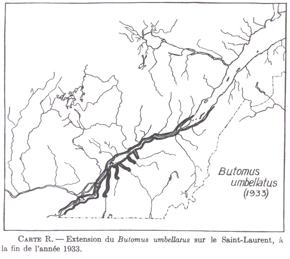 Carte R. ― Extension du Butomus umbellatus sur le Saint-Laurent, à la fin de l'année 1933.