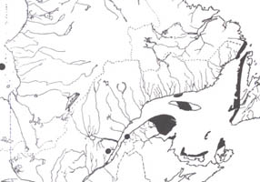 du Canada oriental. Les parties en noir solide indiquent les régions qui sont considérées comme ayant