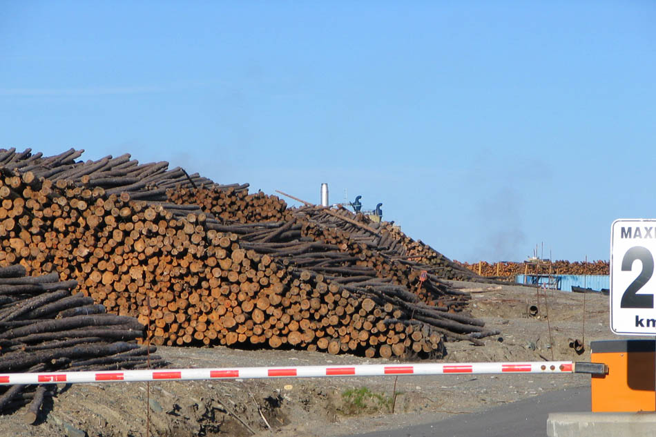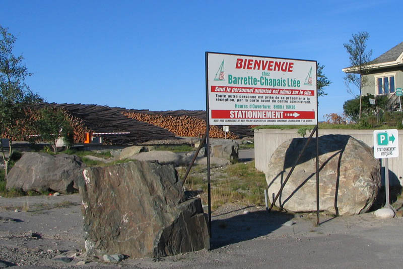 Chapais, Barrette-Chapais Ltée, usine de sciage, guérite, tas de bois, 07:01 le dimanche 24 juillet 2005,