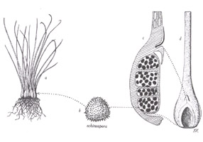 (b) mégaspore, (c) section longitudinale de la base d'une feuille à