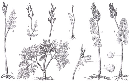 sommité fructifère, (g) spore ; (h-i) B. lunaria, (h) plante entière, (i) spore.