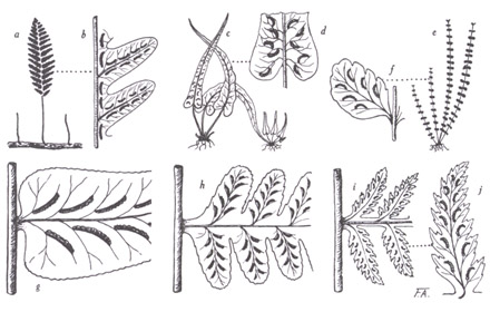 plante entière, (f) segment secondaire de fronde stérile, (g) segment secondaire