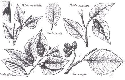 Betula : (a-b) B. populifolia, (a) rameau avec chatons pistillés jeunes, (b) calus noir à l'insertion d'une branche ; (c) B. alleghaniensis, rameau fructifère ; (d) B. pumila, feuille ; (2) B. papyrifera, rameau fructifère. —  Alnus : (f) A. rugosa, rameau fructifère. Dessins du frère Alexandre Blouin.