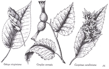 Ostrya : 0. virginiana, feuille et cône. — Corylus : C. cornuta, rameau fructifère. — Carpinus : C. caroliniana feuille et fruits. Dessins du frère Alexandre Blouin.
