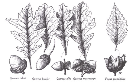 Quercus : feuille et fruit (gland) des espèces laurentiennes. — Fagus : F. grandifolia, feuille et fruits (faînes). Dessins du frère Alexandre Blouin.