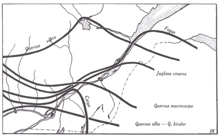 Limite approximative, au nord, des fagacées et juglandacées du Québec. Dessin du frère Alexandre Blouin.