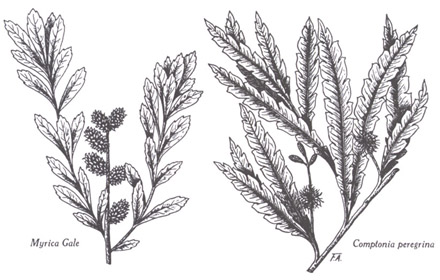 Myrica : M. gale, rameau fructifère.― Comptonia : C. peregrina, rameau fructifère. Dessins du frère Alexandre Blouin.