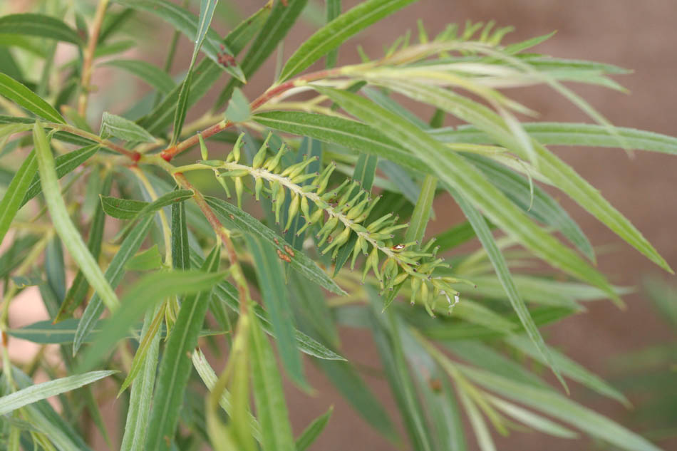 très longs (longueur 5-8 cm) avant l'apparition des feuilles ; feuilles