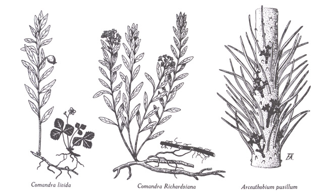 Comandra : C. livida, parasite sur Fragaria virginiana ; C. richardsiana, parasite sur racine d'Ostrya virginiana. — Arceuthobium : A. pusillum, parasite sur rameau de Picea glauca. Dessins du frère Alexandre Blouin.