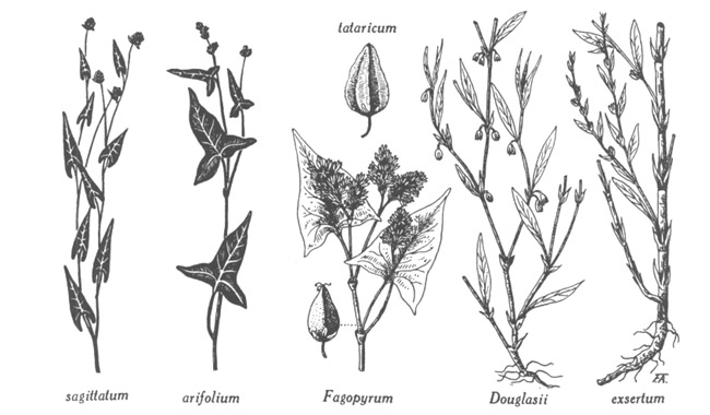 Polygonum : P. sagittatum, sommité florifère ; P. arifolium, sommité florifère ; P. fagopyrum, sommité florifère et fruit ; P. tataricum, fruit ; P. douglasii, rameaux florifères ; P. exsertum, rameaux florifères. Dessins du frère Alexandre Blouin.