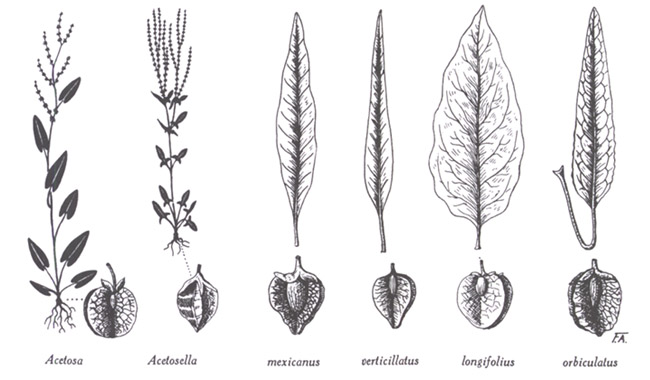 Rumex : R. acetosa, plante entière et fruit ; R. acetosella, plante entière et fruit ; R. mexicanus, feuille et fruit ; R. verticillatus, feuille et fruit ; R. longifolius, feuille et fruit ; R. orbiculatus, feuille et fruit. Dessins du frère Alexandre Blouin.