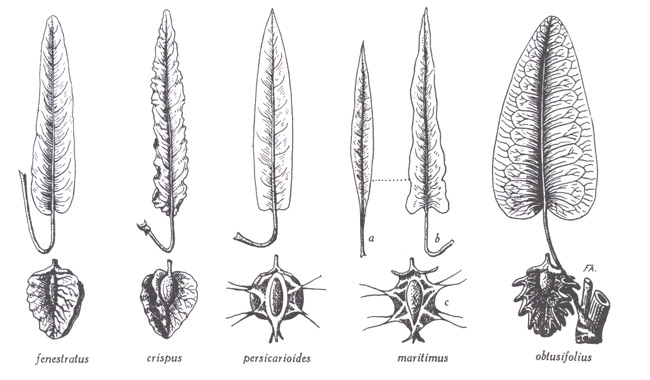 Rumex : R. fenestratus, feuille et fruit ; R. crispus, feuille et fruit ; R. persicarioides, feuille et fruit ; R. maritimus, (a) feuille du type européen introduit, (b) feuille du var. fueginus indigène, (c) fruit ; R. obtusifolius, feuille et fruit. Dessins du frère Alexandre Blouin.