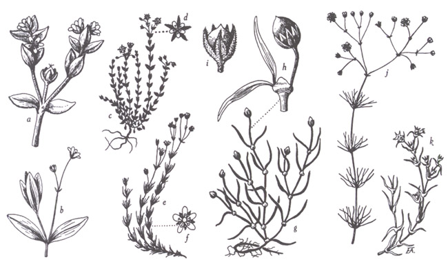 entière, (d) fleur ; (e-f) A. stricta, (e) plante entière, (f) fleur. — Spergularia :