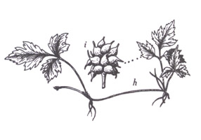Ranunculus repens,(h) tronçon de tige, (i) épi fructifère.
