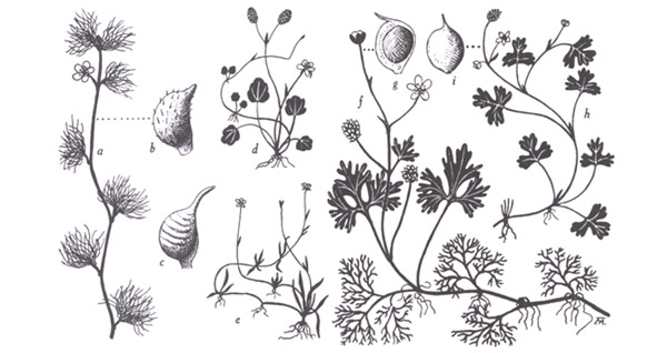 R. abortivus, (a) feuille, (b) fleur ; (c-e)