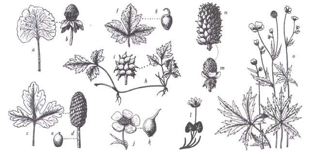 fruit ; (1) R. ficaria, rameau florifère ; (m-n)