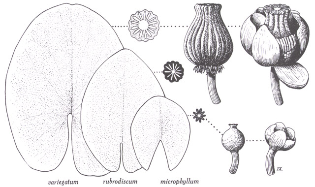 Nuphar : N. variegatum, feuille, disque stigmatique, fruit et fleur ; N. rubrodiscum, feuille et disque stigmatique ; N. microphyllum, feuille, disque stigmatique, fruit et fleur. Dessins du frère Alexandre Blouin.