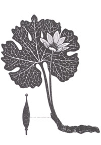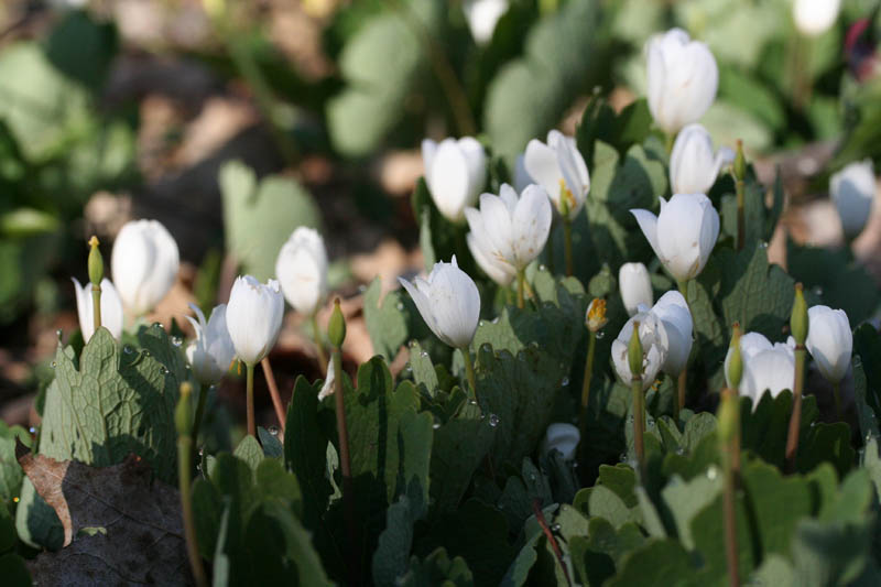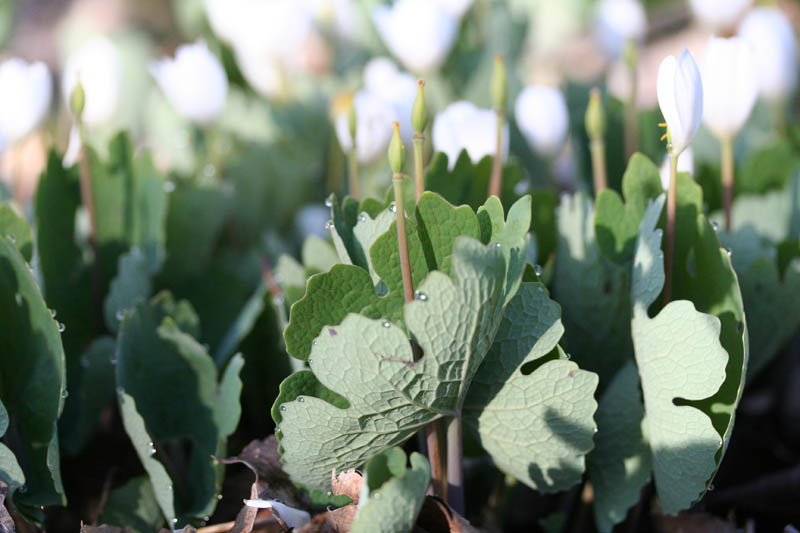 Famille 39. ― PAPAVERACEAE [ PAPAVÉRACÉES ]. 2. SANGUINARIA Linné. — SANGUINAIRE. 1. Sanguinaria canadensis Linné. — Sanguinaire du Canada. — Sang-dragon. — (Bloodroot). — Feuilles (diamètre à la maturité, 15-30 cm) ; fleur (diamètre 25-40 mm) ; capsule (longueur20-25 mm). Floraison très printanière. Bois riches. Général, dans la forêt feuillue.