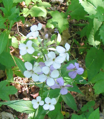 — Tige (longueur 40-60 cm) ; feuilles (longueur 8-20 cm) dentées, un peu rudes ; fleurs (diamètre 15-25 mm) blanches ou lilacées ; siliques (longueur 10-12 cm). Floraison estivale. Le long des routes et des rivières. Général.