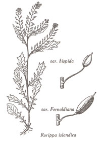 Espèce biologiquement intéressante parce qu'elle comprend des variétés ou races distinctes et séparées par des caractères discontinus. Le Rorippa islandica typique européen n'existe ici que comme épibiote (Anticosti) ou comme plante de ballast, mais on trouve partout dans le Québec, et dans l'Amérique du Nord généralement, deux plantes dont les relations avec la plante de l'Europe peuvent s'exprimer ainsi : le R. islandica est une large espèce polymorphe ayant une phase glabre dans l'Eurasie (var. islandica}, une autre phase glabre en Amérique (var. fernaldii Butters &