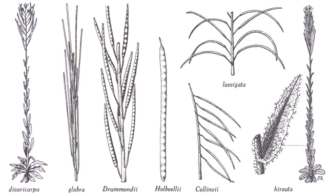 Arabis : A. divaricarpa, plante entière ; A. glabra, sommité fructifère ; A. drummondii, sommité fructifère ; A. holboellii, silique ; A. collinsii, groupe de siliques ; A. laevigata, groupe de siliques ; A. hirsuta, plante entière et feuille médiane. Dessins du frère Alexandre Blouin.