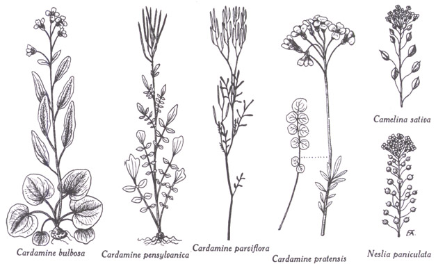 Cardamine : C. bulbosa, plante entière ; C. pensylvanica, plante entière ; C. parviflora, sommité fructifère ; C. pratensis, sommité florifère et feuille basilaire. ― Camelina : C. sativa, sommité florifère et fructifère. ― Neslia : N. paniculata, sommité florifère et fructifère. Dessins du frère Alexandre Blouin.