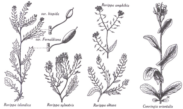 Rorippa : R. islandica, plante entière (variétés illustrées par leur silique) ; R. sylvestris, sommité florifère et fructifère ; R. amphibia, sommité florifère et fructifère ; R. obtusa, sommité fructifère. ― Conringia : C. orientalis, plante entière. Dessins du frère Alexandre Blouin.