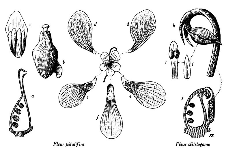 — Les fleurs cléistogames ne diffèrent pas essentiellement des fleurs normales : ce sont simplement des fleurs rudimentaires, où tous les organes, sauf les sépales, sont frappés de dégénérescence morphologique. La corolle fait entièrement défaut, exception faite parfois pour 1-5 (surtout 2) pétales abortifs. Les étamines sont généralement au nombre de deux, très rarement cinq, et chacune ne porte que deux ou trois sacs polliniques, au lieu de quatre. Ceux-ci renferment généralement moins de pollen. Les parois des anthères sont elles-mêmes très modifiées. Chez les étamines des fleurs normales, elles renferment une assise subépidermique élastique qui amène la déhiscence. Chez les fleurs cléistogames, cette assise faisant défaut, les anthères ne peuvent s'ouvrir, mais les grains de pollen germent à l'intérieur du sac pollinique et sortent par un pore qui s'ouvre dans un point faible, au sommet de l'anthère. Les cellules de cette zone sécrètent d'ailleurs, comme les stigmates, des substances sucrées. Le pore terminal des anthères se trouvant vis-à-vis le stigmate, les tubes polliniques pénètrent directement dans le style ; mais celui-ci n'est pas creux comme celui des fleurs normales ; il est comblé par un tissu qui est l'équivalent de l'épiderme sécréteur interne du style des fleurs normales. Le stigmate et le style sont réduits. Le calice demeurant toujours fermé chez les fleurs cléistogames, celles-ci ne connaissent que l'autofécondation. Par contre, les fleurs normales, renfermant des nectaires qui attirent les insectes, sont fortement exposées à la fécondation croisée : ce qui explique le nombre considérable d'hybrides d'espèces que l'on rencontre chez les