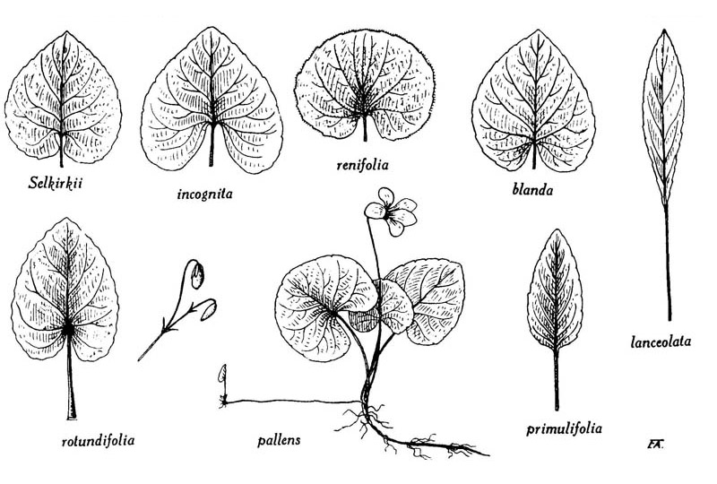 V. nephrophylla, feuille, capsule et pétale de l'éperon. |