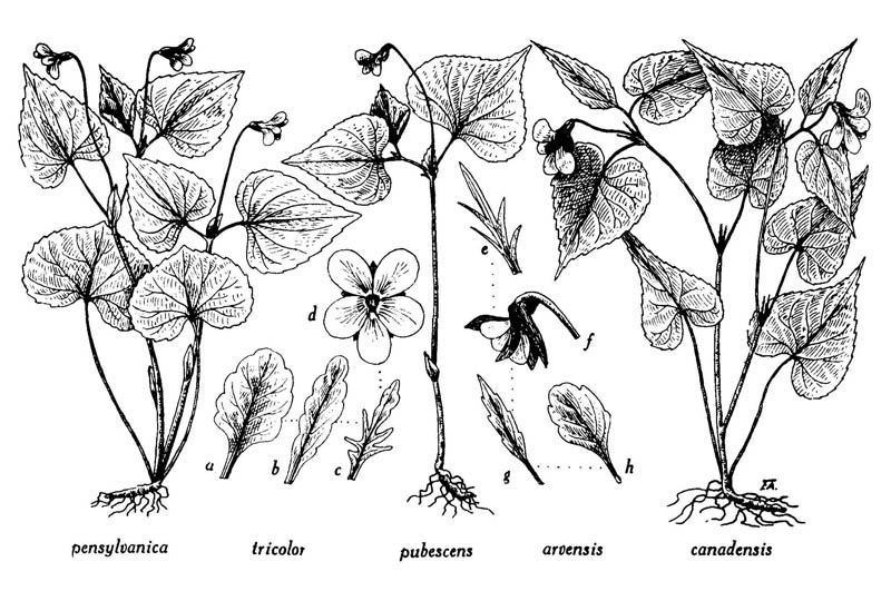Viola : V. pensylvanica, plante entière ; V. tricolor, (a-b) feuilles, (c) stipule, (d) fleur ; V. pubescens, plante entière ; V. arvensis, (e) stipule, (f) fleur, (g-h) feuilles ; V. canadensis, plante entière.