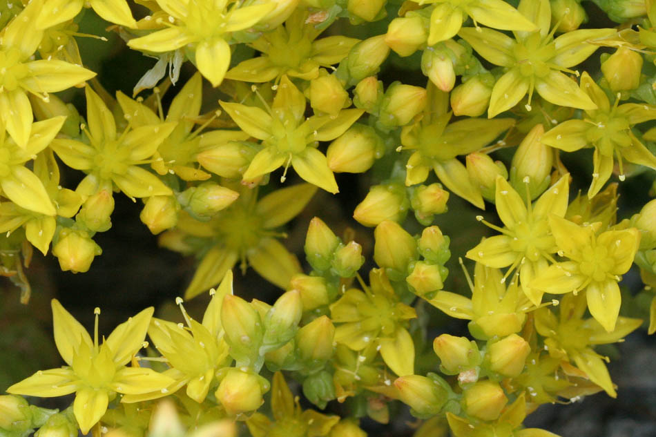 (longueur 3-4 mm) sessiles, ovées, très épaisses ; fleurs (diamètre environ 8 mm) jaunes, 4-mères, sauf la centrale qui est souvent 5-mère ; follicules (longueur 3-5 mm). Floraison estivale. Cultivé ; naturalisé parfois sur les rochers secs, surtout calcaires, et les graviers maritimes. Général, mais plutôt rare.