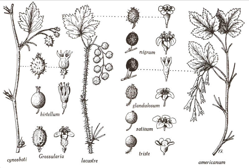 R. cynosbati, rameau fructifère, fruit et fleur ;