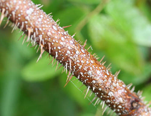 — Tiges (longueur 1-2 m) fortement réclinées, portant de très forts aiguillons triangulaires ; feuilles à rachis fortement glanduleux, folioles