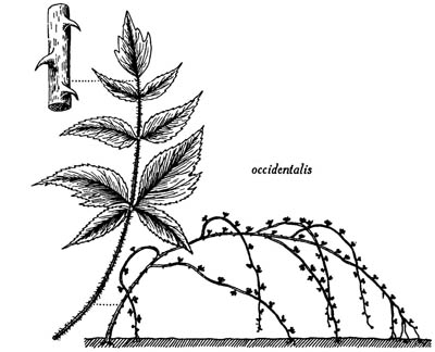 R. occidentalis, schéma de la plante entière à la feuillaison, feuille, portion de la tige