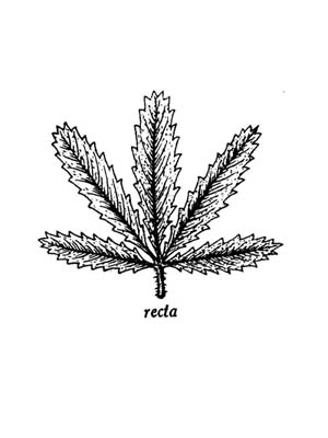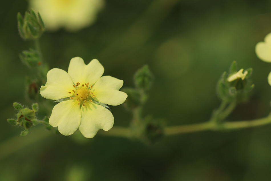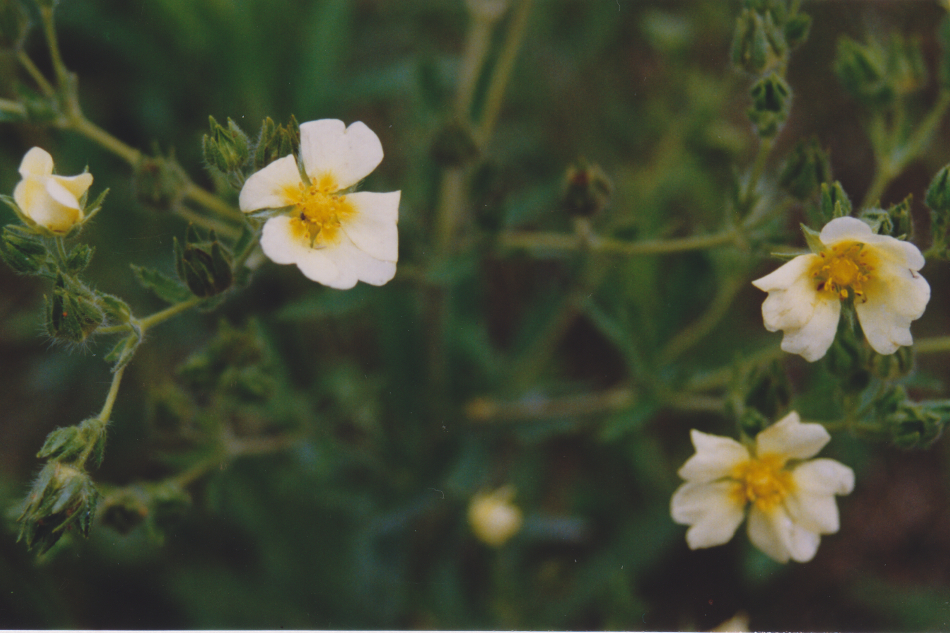 — Plante vivace ; tige (longueur 50-70 cm) dressée ; feuilles digitées, 5-8 foliolées, à folioles munies de très fortes dents divergentes ; fleurs jaunes en cymes peu feuillées et pauciflores ; fleurs grandes (diamètre 12-18 mm). Floraison estivale. Lieux secs. Ouest du Québec seulement. Naturalisé d'Europe.
