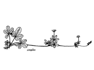 — Plante vivace, à rhizome court ressemblant à un bulbe; tiges (longueur 40-60 cm) généralement ramifiées, d'abord dressées, ensuite couchées et flagelliformes ; feuilles digitées, à 5 folioles; fleurs jaunes (diamètre 6-15 mm), solitaires dans les aisselles des feuilles. Floraison printanière. Terrains secs et vieux pâturages. Ouest du Québec seulement. (Synonyme: P. canadensis des auteurs, non Linné).