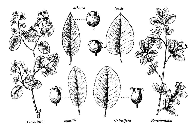 rameau florifère, fruit, coupe de la fleur, sépale, feuille adulte. |