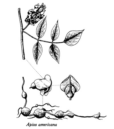 Les graines de l'apios sont plus légères que l'eau, et cette légèreté, qui aide sans doute à la distribution le long des rivages, est due aux lacunes des tissus de l'embryon. La plante adulte présente un phénomène qui, pour n'être pas sans analogue, n'en est pas moins curieux. Les fleurs forment une panicule composée qui semble parfaitement vigoureuse ; un peu avant l'anthèse, le sommet de l'inflorescence se flétrit subitement et tombe, puis les fleurs supérieures des autres grappes font de même, laissant dans les deux cas des cicatrices qui fonctionnent comme des nectaires extra-floraux constamment visités par les fourmis. Mais l'apios attire surtout l'attention par ses chapelets de tubercules comestibles. Arrachés en grande quantité par la glace en mouvement, au moment de la débâcle du Saint-Laurent, ces tubercules sont ensuite flottés, s'enracinant partout où le flot les dépose, jusqu'à la limite de l'eau salée. Ces files de tubercules correspondent à la suite des entrenœuds du rhizome, entrenœuds dont la partie supérieure est renflée, formant une série de ventres ovoïdes, séparés par des parties grêles. Les tubercules sont plus gros vers le milieu du rhizome. Sur chacun d'eux prend naissance un bourgeon qui se développe aux dépens des réserves du tubercule correspondant.