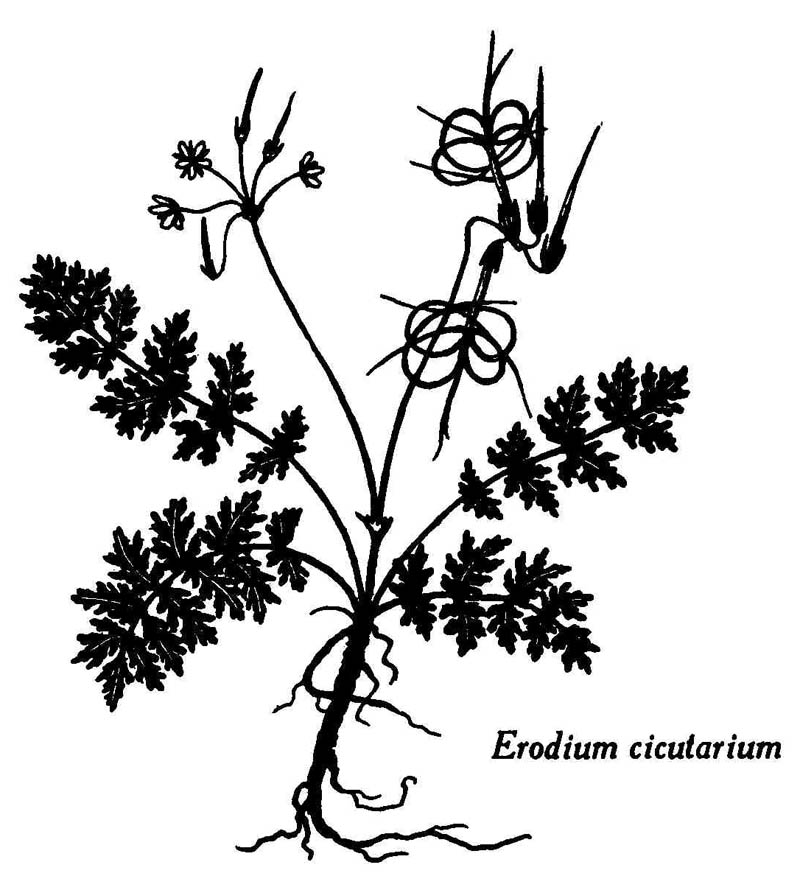 Lorsque le fruit est sur le point d'être disséminé, les carpelles, auxquels les graines sont attachées, se détachent par la base, les filets qui les retenaient le long de l'axe central se séparent et forment des spirales enroulées sur elles-mêmes de droite à gauche. L'axe lui-même se contourne aussi. Ces fruits mûrs restent ainsi suspendus assez longtemps, étalant d'élégantes aigrettes, puis se détachent et tombent sur le sol ; là, les arêtes exécutent encore des mouvements de torsion subordonnés à l'humidité de l'air, et qui tendent à maintenir les graines à la surface du sol ou à les y faire pénétrer. Une fois les graines tombées, les pédoncules se redressent entièrement.