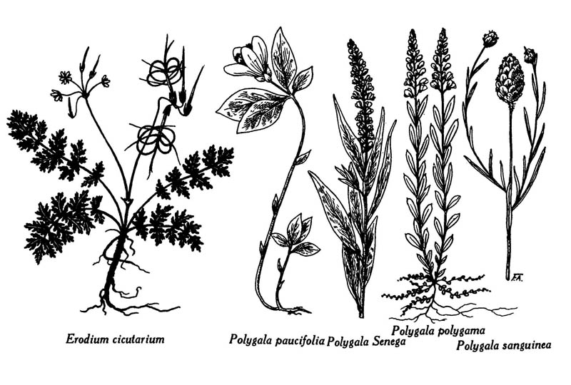 Erodium : E. cicutarium, plante entière florifère et fructifère. — Polygala : P. paucifolia, plante entière en fleur ; P. senega, sommité florifère ; P. polygama, plante entière en fleur, avec fleurs cléistogames souterraines ; P. sanguinea, sommité florifère.