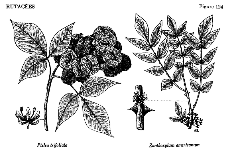 Ptelea : P. trifoliata, rameau fructifère, fleur. — Zanthoxylum : Z. americanum, rameau fructifère, portion de tige avec fleurs staminées et stipules épineuses persistantes.