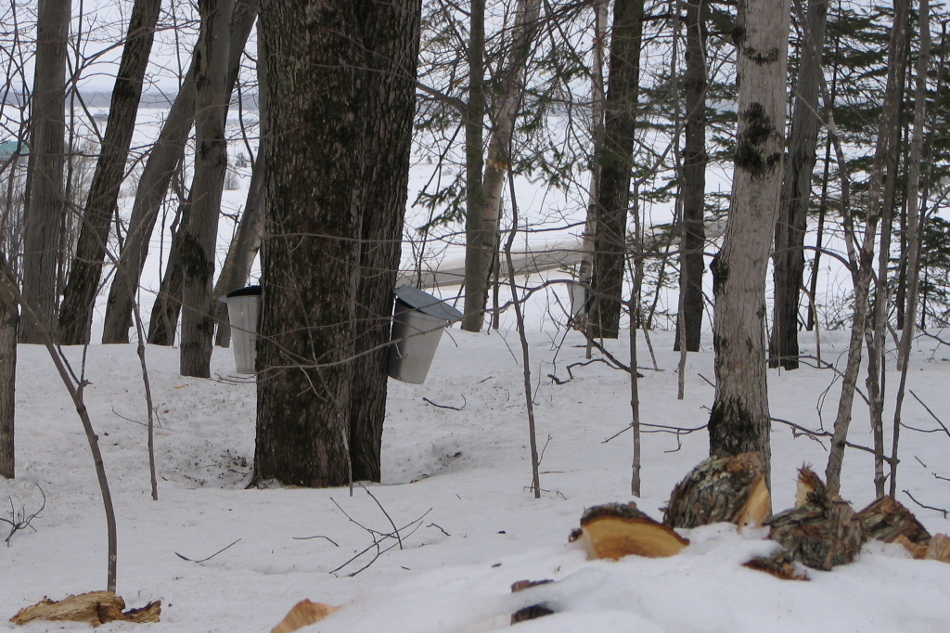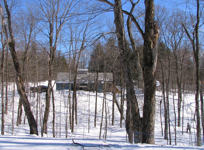 érablière Guy Cossette, cabane à sucre, érables entaillés et tubulure, en raquettes : Stella Cossette,