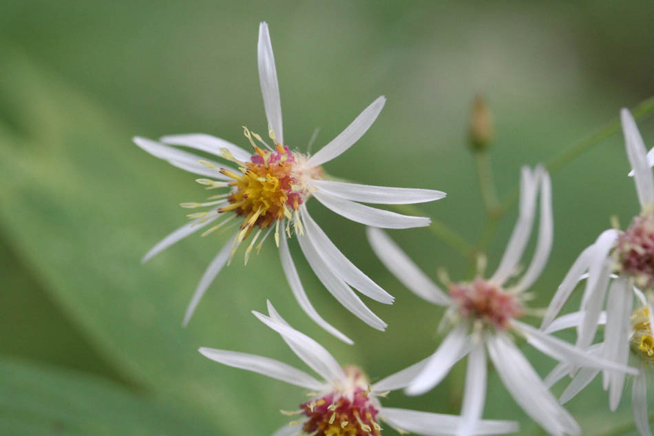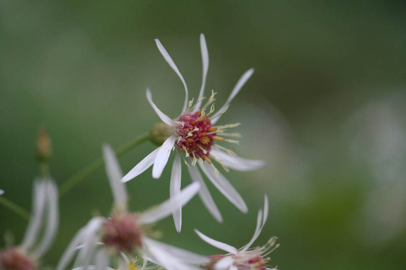 rayons (longueur 12-15 mm) étroits, blancs ou purpurins. Floraison automnale. Partout dans les bois montueux du Québec.