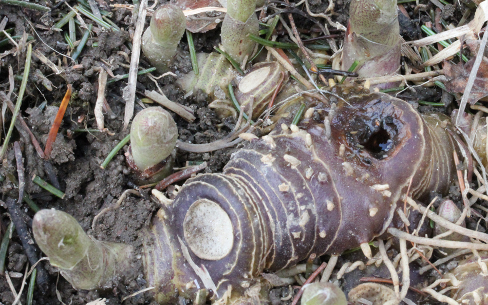 Smilacines. Le rhizome s'allonge horizontalement dans la terre et envoie verticalement dans l'air des tiges feuillées florifères qui meurent à l'automne. Dans ce genre, à l'encontre d'autres plantes rhizomateuses (Chiendent, Butome, etc.), c'est l'extrémité même du rhizome qui se relève verticalement et vient étaler à l'air ses feuilles et ses fleurs. Cette portion verticale périt à la fin de la saison et le rhizome se trouve tronqué. Mais le bourgeon axillaire le plus proche de la cicatrice se développe alors en une branche horizontale qui prolonge la tige et, au printemps suivant, redresse à son tour son extrémité dans l'air et ainsi de suite. Le nombre des cicatrices indique l'âge minimum du rhizome et leur apparence a fait donner à la plante qui les porte le nom vulgaire de Sceau-de-Salomon. Dans presque tous les manuels de botanique, le Sceau-de-Salomon (figuré d'après l'une des espèces eurasiatiques) est l'exemple classique du rhizome et du sympode souterrain.