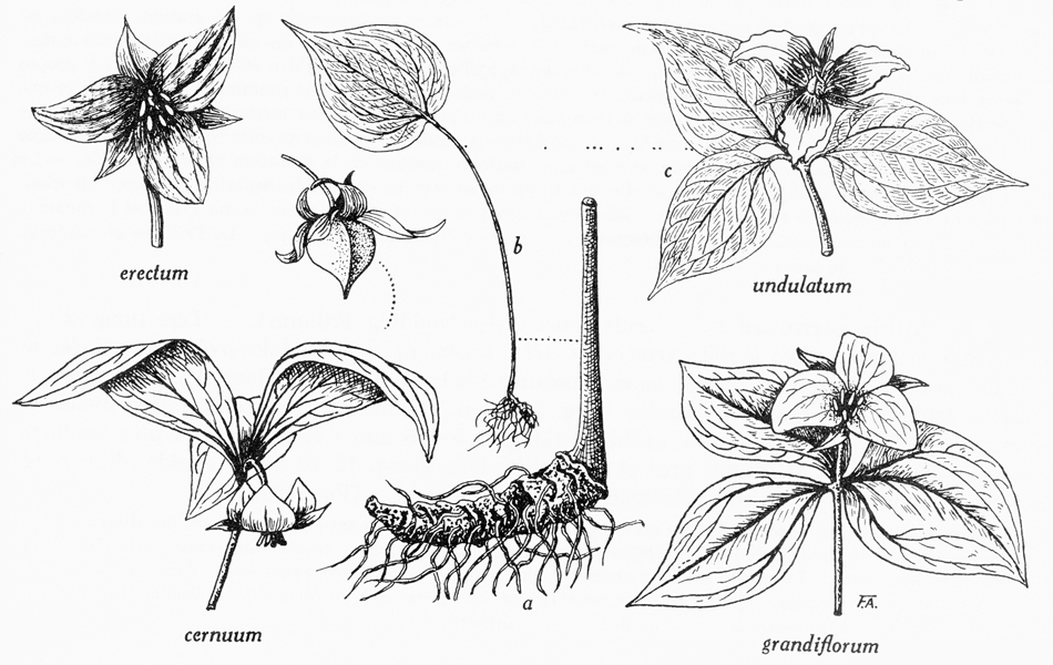 M. virginiana, (a) sommité florifère, (h) rhizome, (c) fleur, (d) fruits.
